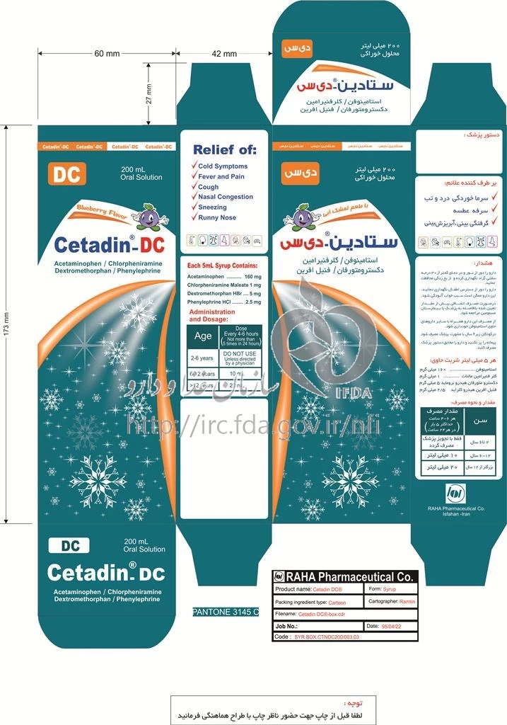 این دارو یک سیروپ مخصوص درمان سرفه، عطسه، سردرد و تب است. ترکیب این دارو شامل چهار ماده موثر می باشد: ACETAMINOPHEN که برای کاهش تب ، درد و التهاب استفاده می شود. CHLORPHENIRAMINE که یک آنتی هیستامین است و علائم تنفسی را تسکین می دهد. DEXTROMETHORPHAN جلوگیری از سرفه و PHENYLEPHRINE برای تسکین علائم گرفتگی و افتادگی بینی استفاده می شود. زمانی که از این دارو استفاده کنید، دستورالعمل های دارو را دقیقاً باید دنبال کرد. این دارو باید به صورت خوراکی مصرف شود. معمولاً تقریباً هر ۴ تا ۶ ساعت 1-2 قاشق غذاخوری از این دارو به صورت مقدار خود تجویز میشود. خوراکی را قبل از مصرف همیشه با آب یا مایع دیگری که پزشکتان توصیه کرده است بنوشید. همچنین ممکن است نیاز باشد که توصیه های اخصاصی برای استفاده از این دارو برحسب وضعیت سلامتی شما داده شود. پیش از استفاده از این دارو با پزشک خود مشورت کنید.