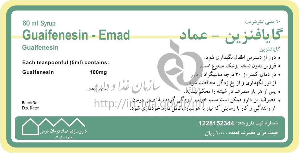 گایافنزین - عماد شربت خوراکی 100 mg/5mL 60MILLILITER
