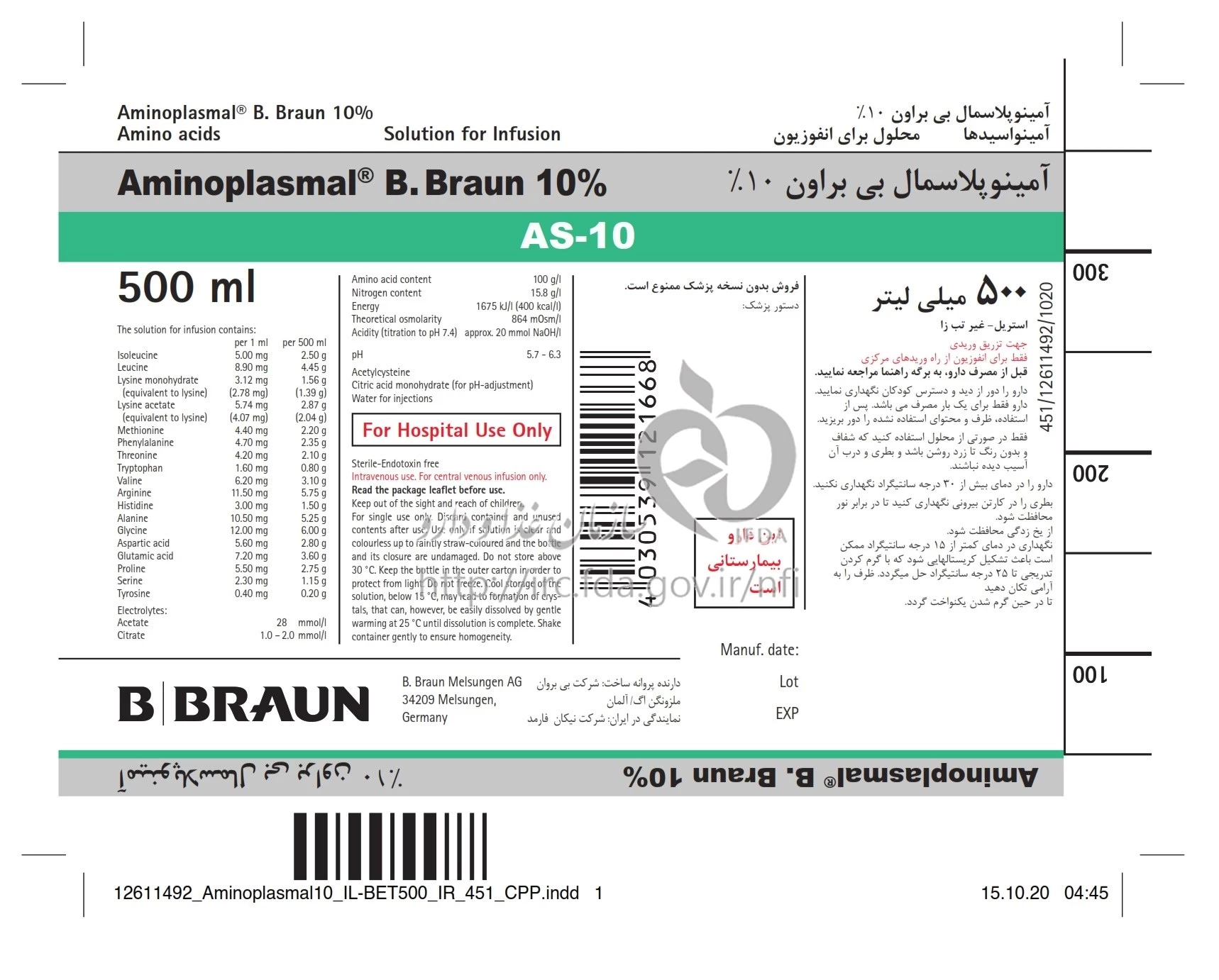 آمینوپلاسمال بی.براون 10 % محلول تزریقی داخل وریدی 5 mg/8.9 mg/5.74 mg/3.12 mg/4.4 mg/4.7 mg/4.2 mg/1.6 mg/6.2 mg/11.5 mg/3 mg/10.5 mg/12 mg/5.6 mg/7.2 mg/5.5 mg/2.3 mg/0.4 mg/1mL 500MILLILITER