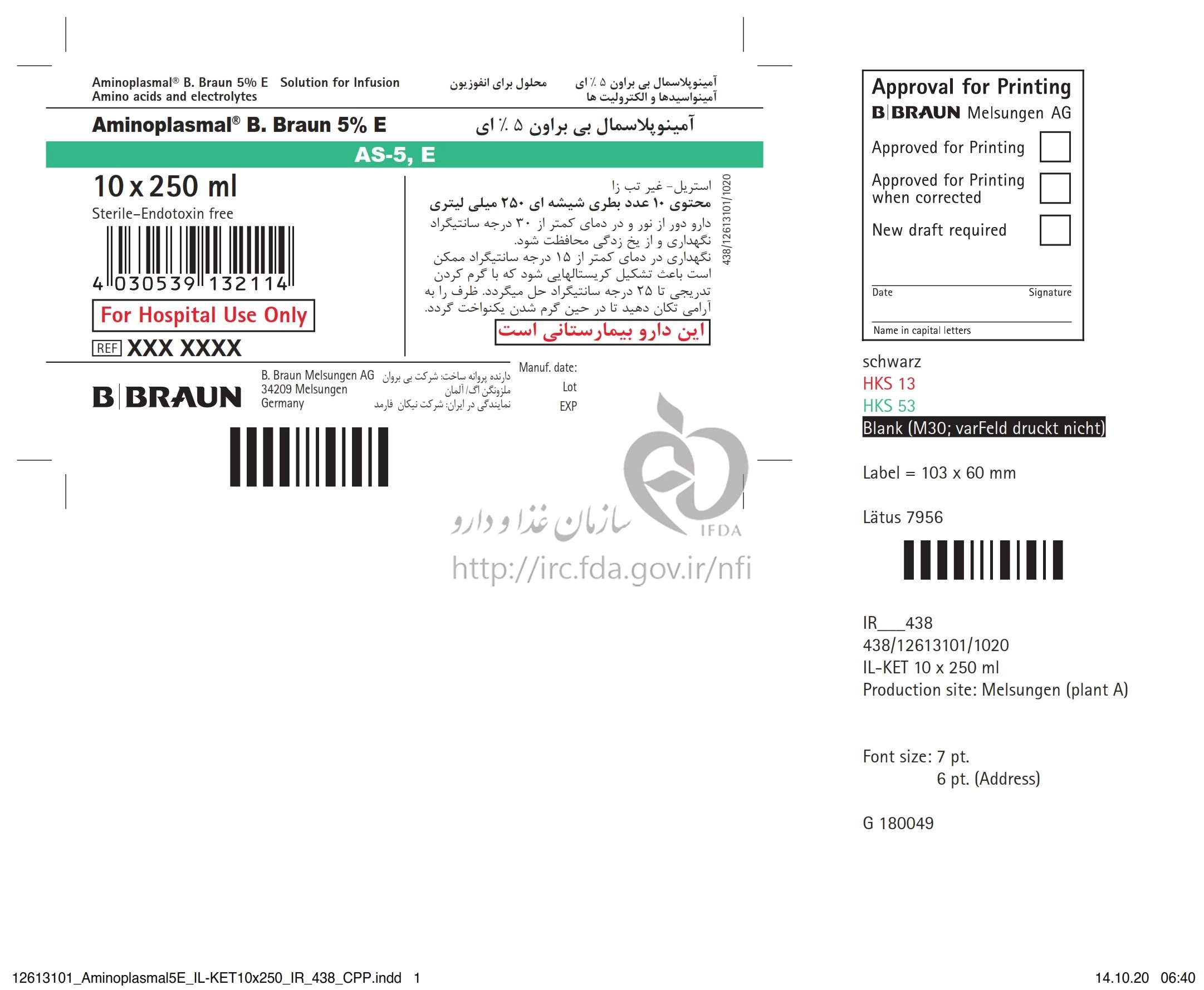 آمینوپلاسمال بی.براون 5% الکترولیت محلول تزریقی داخل وریدی 2.5 mg/4.45 mg/4.28 mg/2.2 mg/2.35 mg/2.1 mg/0.8 mg/3.1 mg/5.75 mg/1.5 mg/5.25 mg/6 mg/2.8 mg/3.6 mg/2.75 mg/1.15 mg/0.4 mg/1.361 mg/0.964 mg/0.14 mg/2.453 mg/0.508 mg/3.581 mg/1mL 250MILLILITER