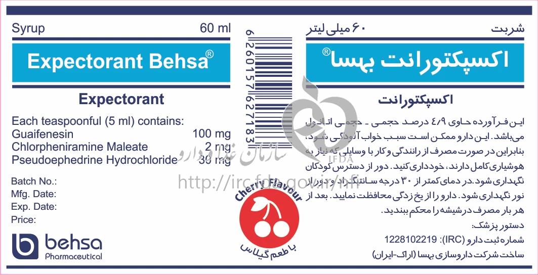 موارد مصرف ، عوارض جانبی ، مصرف بارداری و تداخلات دارویی اکسپکتورانت بهسا شربت خوراکی 100 mg/2 mg/30 mg/5mL 60MILLILITER