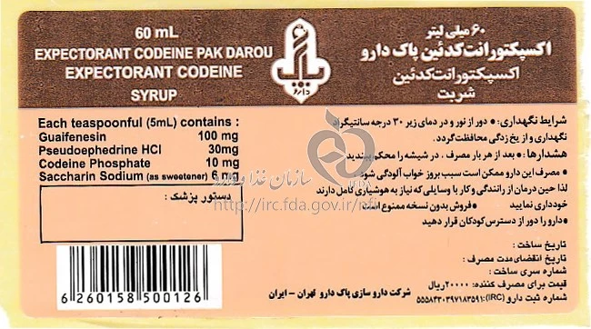 اکسپکتورانت کدئین پاک دارو شربت خوراکی 100 mg/30 mg/10 mg/5 mL 60MILLILITER