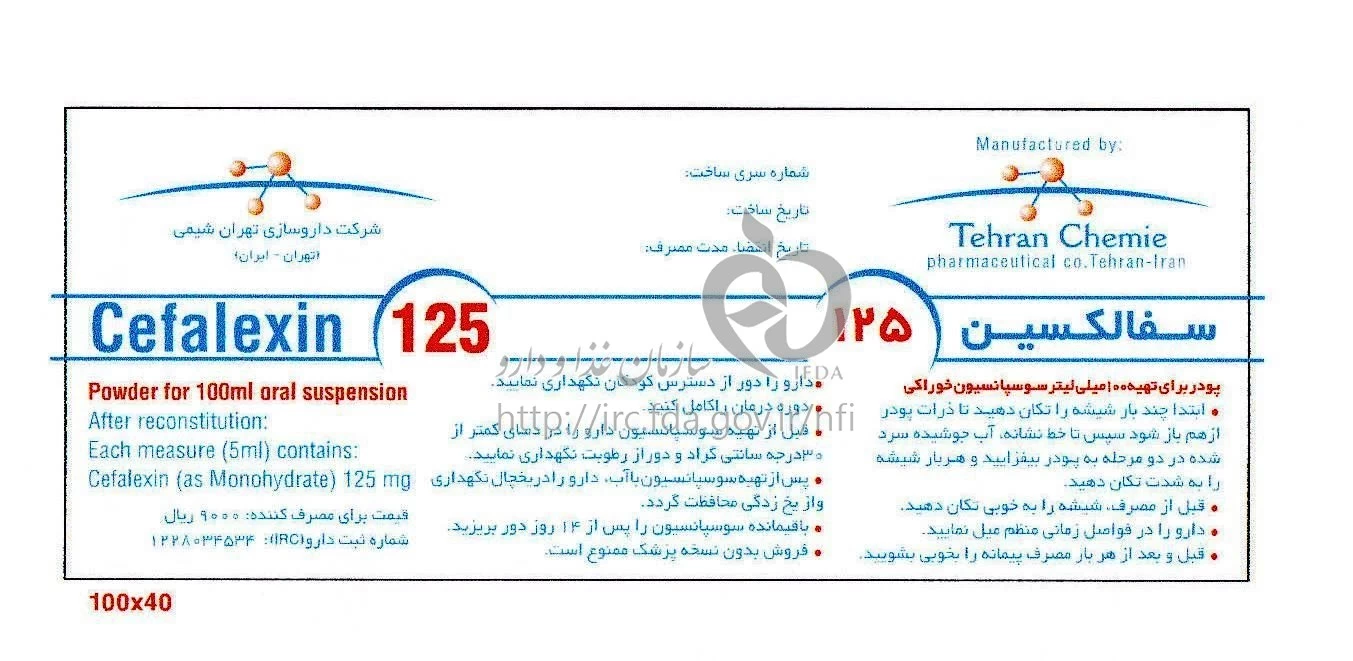 سفالکسین 125 پودر برای تهیه سوسپانسیون خوراکی 125 mg/5mL 100MILLILITER
