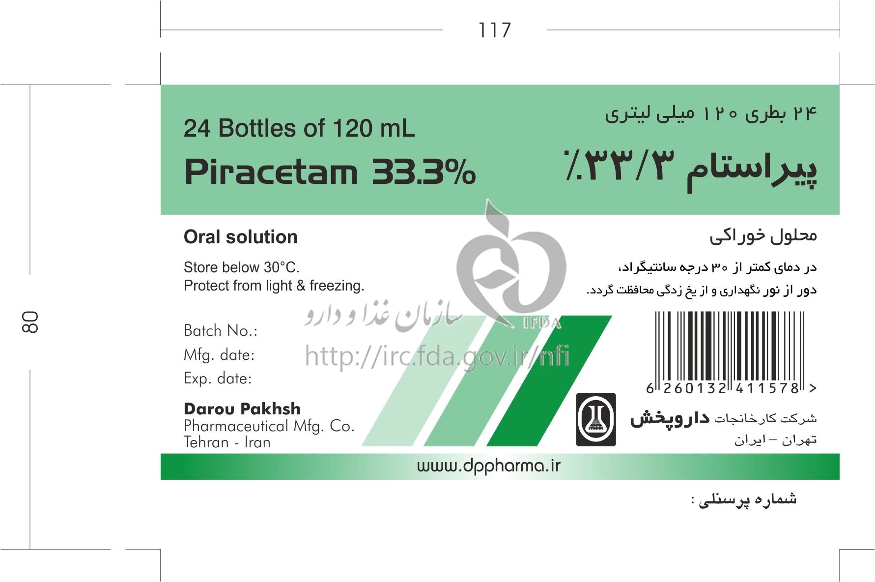 داروی Piracetam Liquid Oral 33.33% یک ماده عصبی است که برای بهبود کارکرد مغز و افزایش حافظه، تمرکز و توجه استفاده می شود. این دارو در درمان اختلالات نورولوژیکی مانند آسم، اپیلپسی، مهاجرت مغزی و سایر اختلالات مغزی و اعصابی استفاده می شود. معمولاً Piracetam برای بزرگسالان به عنوان یک تکنیک معین تجویز می شود. مصرف این دارو بهتر است زیر نظر یک پزشک باشد و برای افراد دارای بیماری های خاص، به دوزهای ویژه ای نیاز دارد. معمولاً Piracetam در دوز 800-1600 میلی گرم در روز به صورت دو یا سه دفعه به مدت 4-8 هفته استفاده می شود. در هر صورت، توصیه شده است که مصرف دارو از راه دهان با یک لیوان آب یا شیر همراه شود. همچنین، در صورت عدم تحمل، عوارض جانبی یا افزایش عوارض جانبی، مصرف این دارو باید توسط پزشک رد شود.