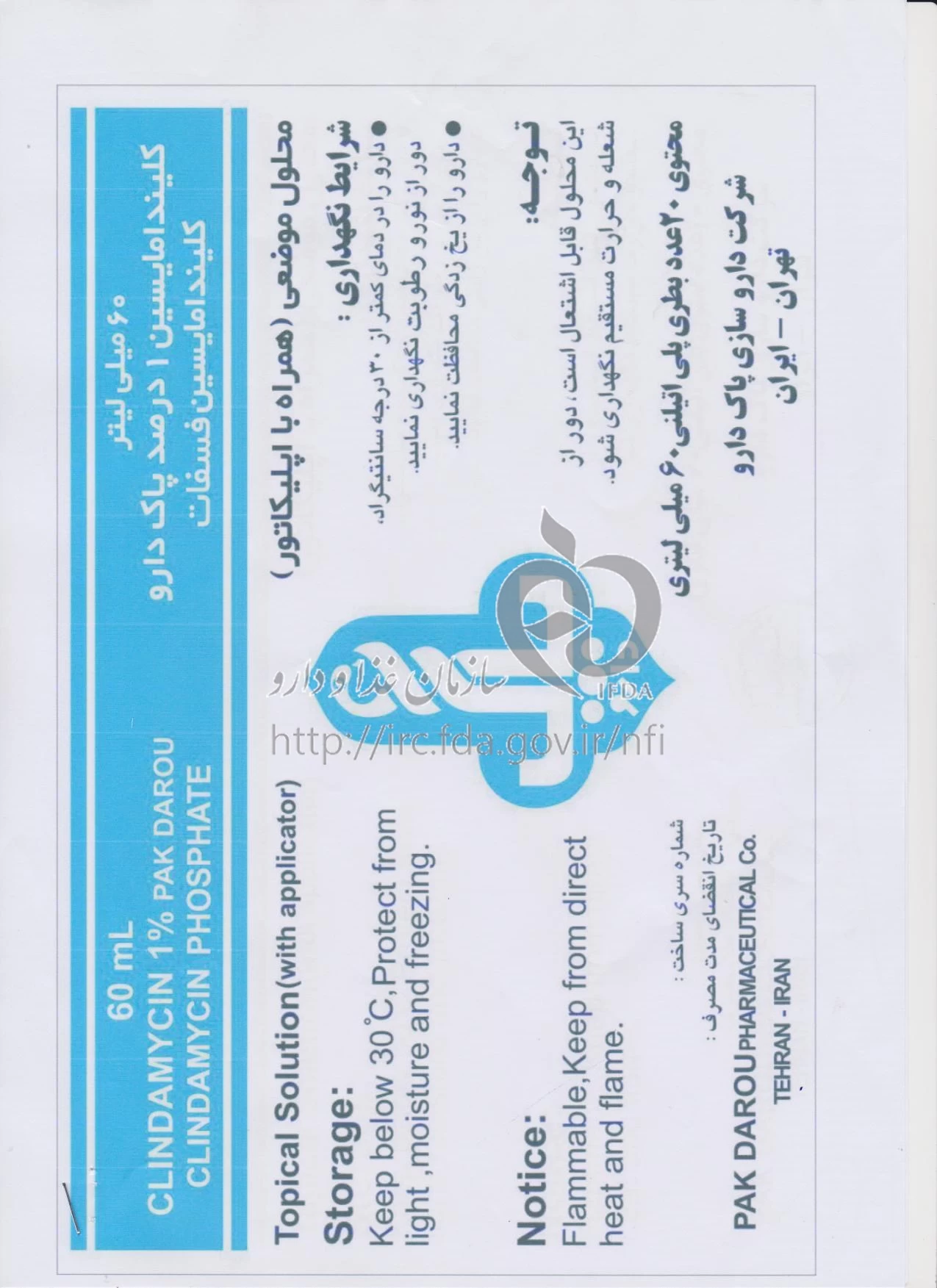 موارد مصرف ، عوارض جانبی ، مصرف بارداری و تداخلات دارویی کلیندامایسین پاک دارو محلول موضعی 10 mg/1mL 60MILLILITER